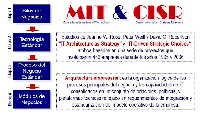 Estudios del MIT Sloan Center for Information Systems Research (CISR 2007), “IT Architecture as Strategy” y “IT-Driven Strategic Choices”, llegaron a la conclusión de cuales eran las etapas que una organización debe seguir a fin de obtener los beneficios de SOA de manera completa y ordenada. Estos estudios involucraron investigaciones en 456 empresas durante los años 1995 y 2006. Dichas etapas de acuerdo al orden secuencial llevaron los siguientes nombres: