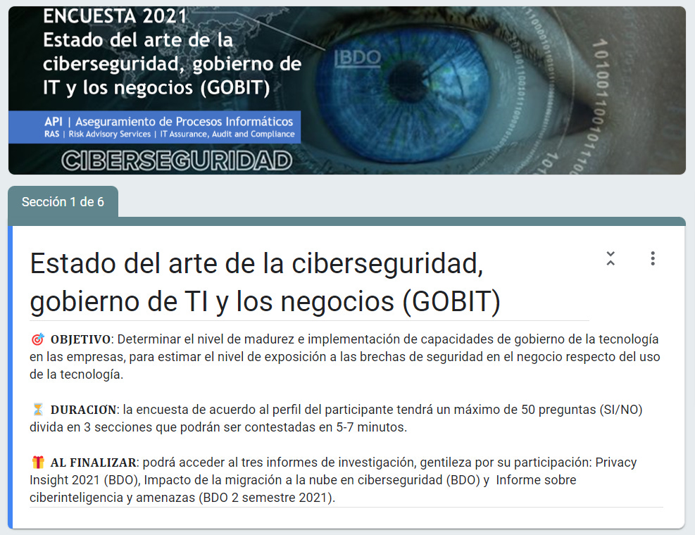 OBJETIVO: El objetivo de nuestro estudio es el de determinar el nivel de madurez e implementación de capacidades de gobierno de la tecnología en las empresas, para estimar el nivel de exposición a las brechas de seguridad en el negocio -respecto del uso de la tecnología-, y cuán distantes pueden estar de alcanzar la transformación digital y contar con herramientas tecnológicas necesarias para innovar.