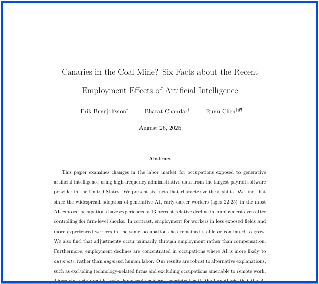 💬 "Estos seis hechos proporcionan evidencia temprana y a gran escala consistente con la hipótesis de que la revolución de la IA está comenzando a tener un impacto significativo y desproporcionado en los trabajadores de nivel de entrada en el mercado laboral estadounidense."