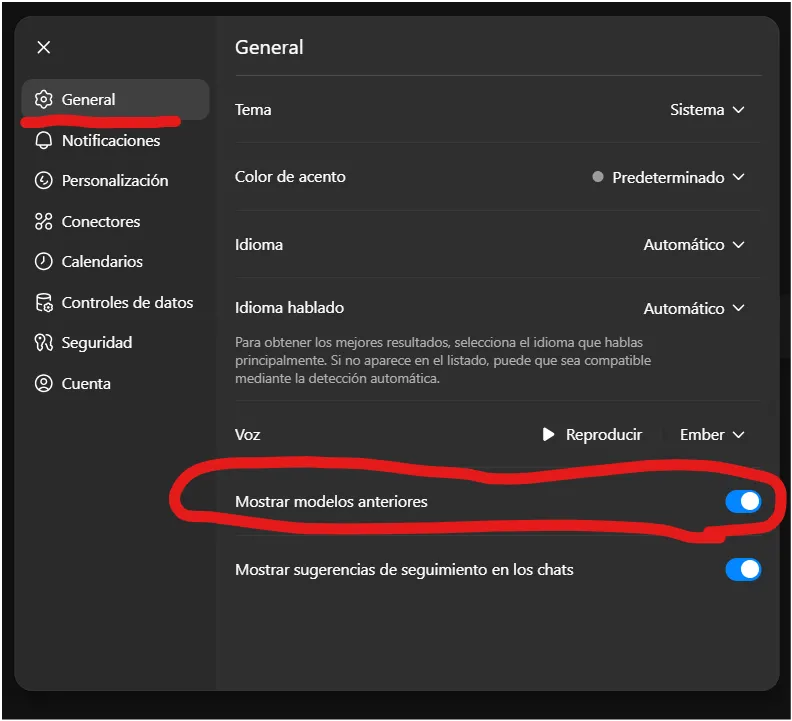 Si quieres seguir eligiendo los modelos “heredados”, para cuentas Plus y Pro, lo debes activar en la configuración general de ChatGPT.