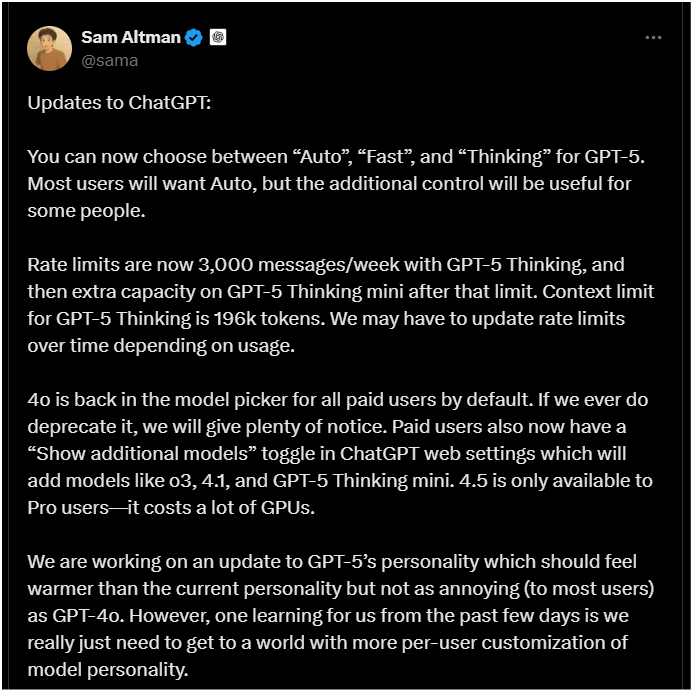 Si la interacción humana/empatía importa, considera reactivar modelos legacy como GPT-4o para mantiene una “voz” más cálida hasta que OpenAI ajuste la personalidad de GPT-5. Sam Altman reconoció que están trabajando en una personalidad de GPT-5 más cálida y personalizable por usuario. (X (formerly Twitter)