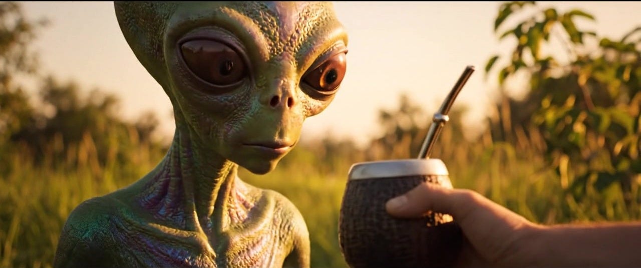 La cámara panea la inmensidad silenciosa de la pampa argentina. Un gaucho, rostro curtido por el sol y el tiempo, mira al horizonte. De pronto, una distorsión en el aire, una presencia que no pertenece. Un ser de otro mundo, de geometría imposible, está frente a él. La tensión es palpable. El gaucho, tras un instante de duda, se agacha lentamente, toma su termo, ceba un mate y, con un gesto sereno y firme, lo extiende.