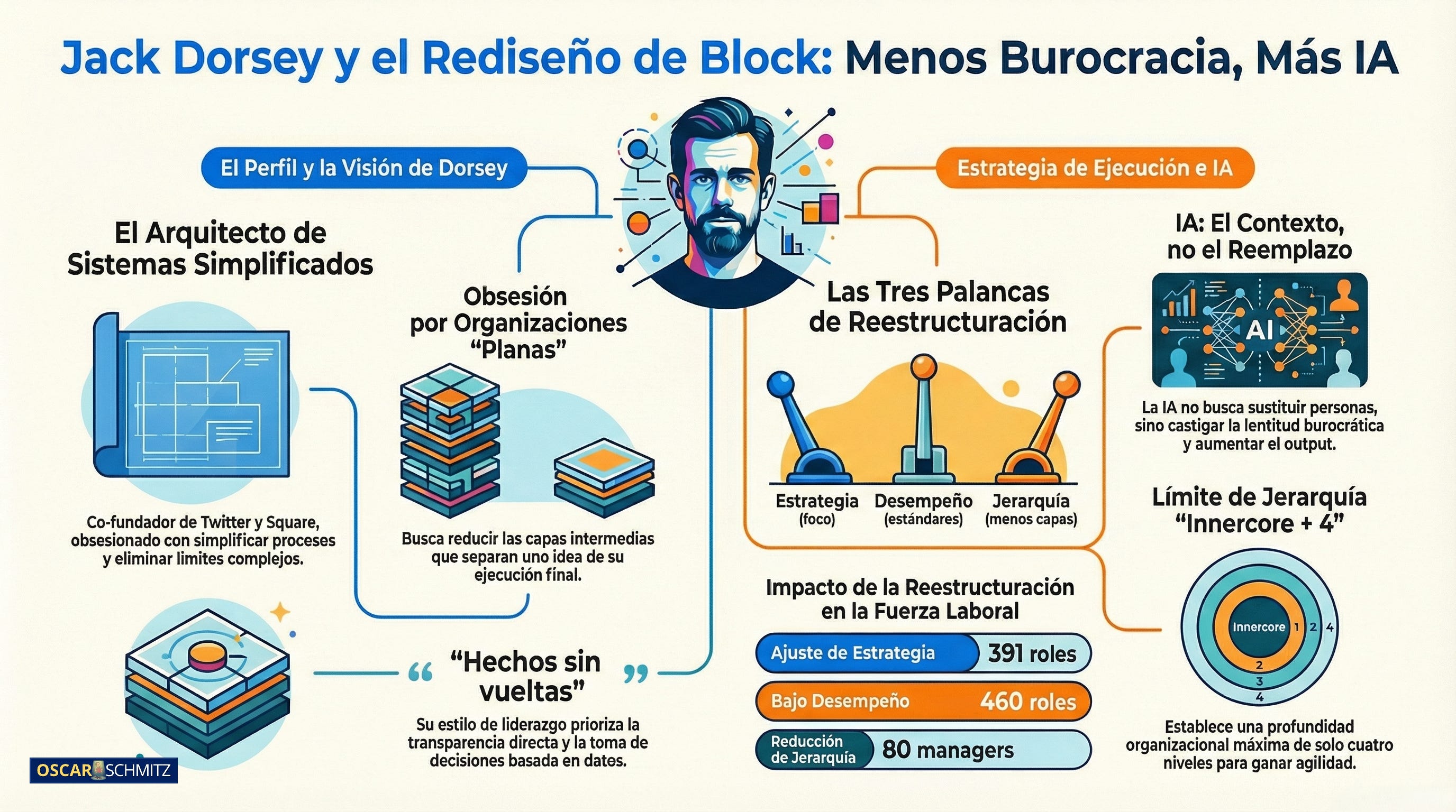“Quiero darles los hechos, sin vueltas”. Con esa frase, Jack Dorsey comunicó una reestructuración interna en Block que combina tres palancas clásicas —estrategia, desempeño y jerarquía— con una ambición moderna: volver a una organización más rápida, más plana y menos “abstracta”.