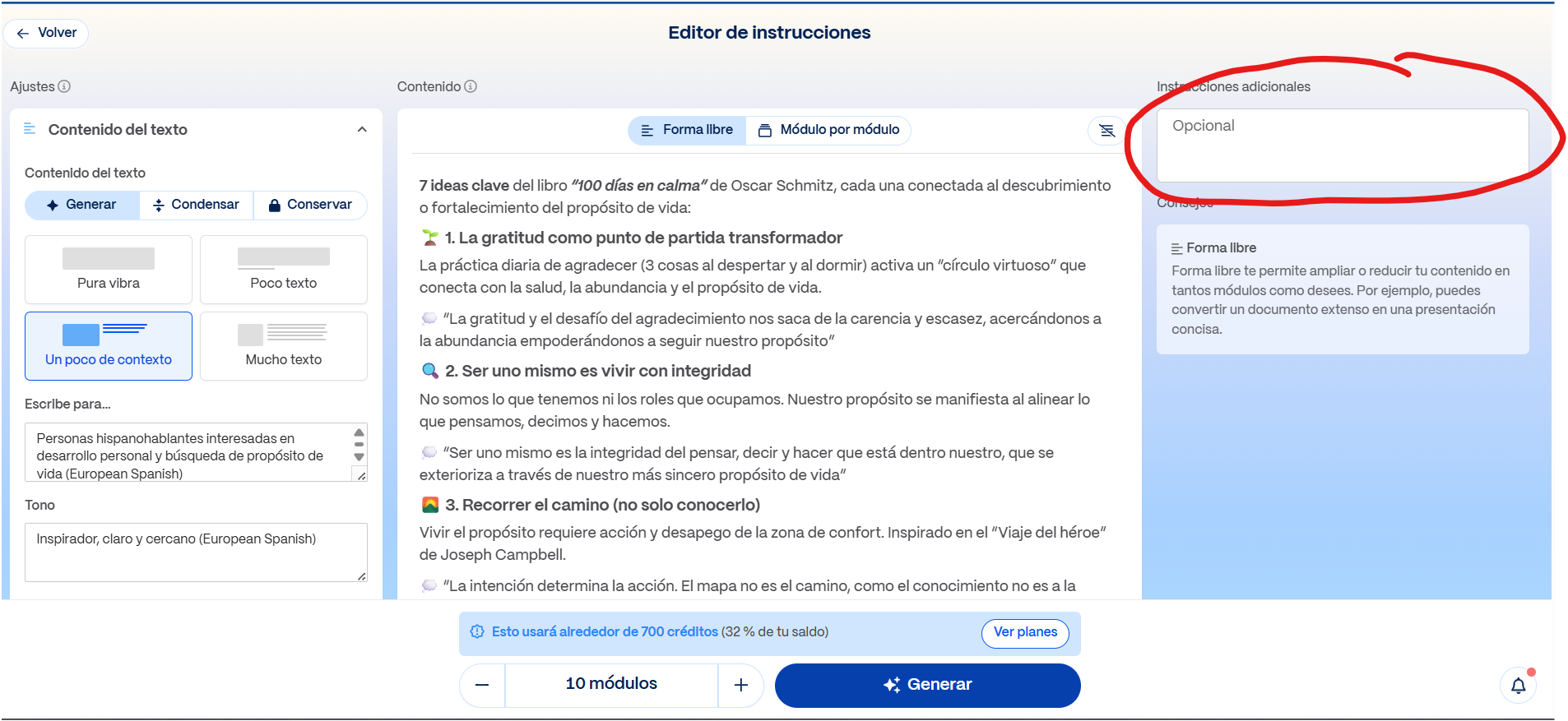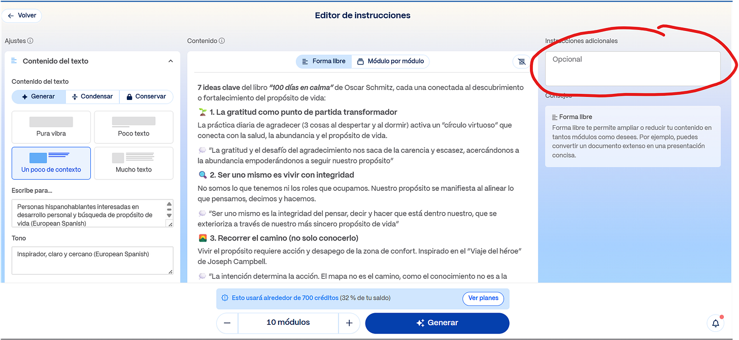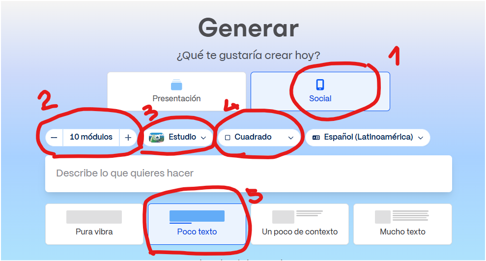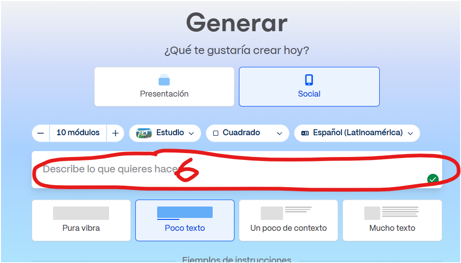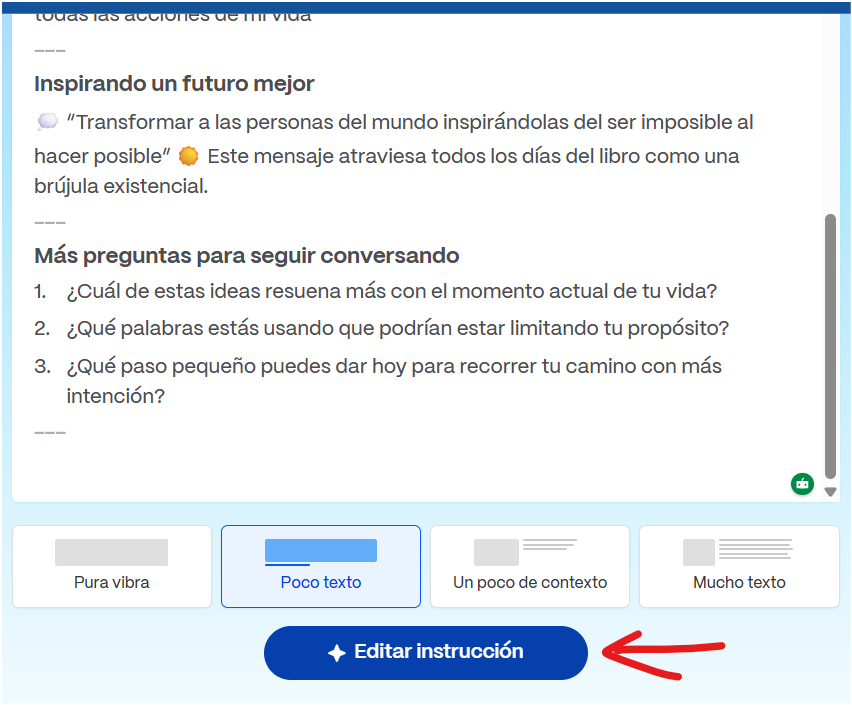 Densidad de texto: Ajusto densidad de texto, por lo general entre “pura vibra” y “poco texto”, pero puedes probar las alternativas para que te quedes con la que más te gusta.
