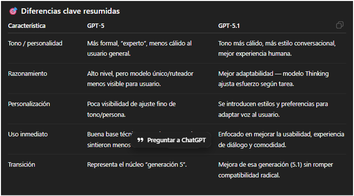Ventaja para usuarios de negocio/ejecutivos: Si tu foco es contenido, asesoría, transformación digital — como es tu caso — la versión 5.1 ofrece mayor flexibilidad para adaptar el tono, lo cual facilita usarlo como herramienta de coaching, estrategia o narrativa.