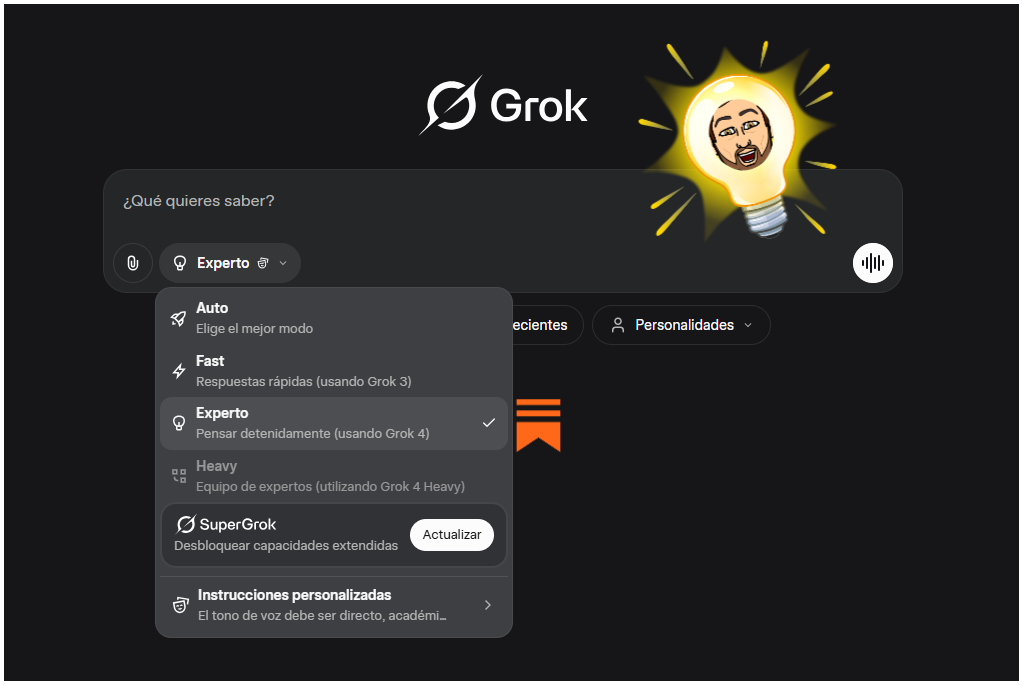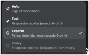 Grok 4, lanzado en julio 2025, introduce el Modo Experto como una extensión de su arquitectura multimodal, permitiendo un razonamiento profundo y autónomo en consultas complejas.