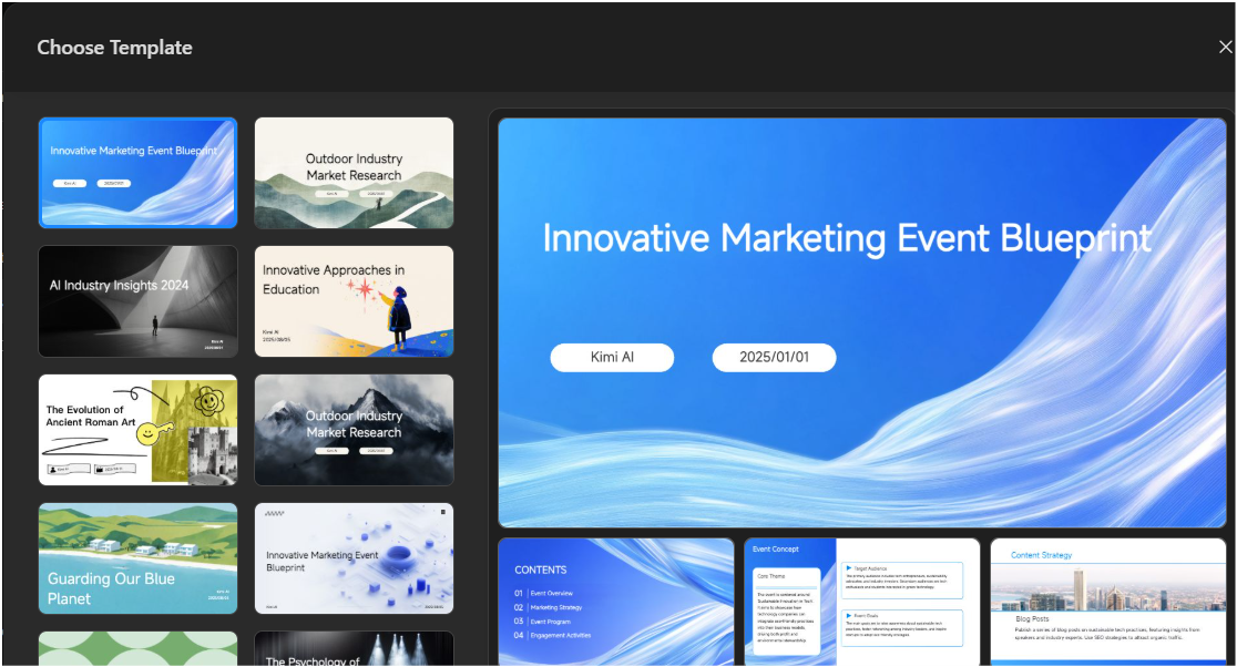 Ejemplo 1 (Marketing): Sube una presentación de PowerPoint (PPTX) sobre una nueva campaña y pídele a Kimi que genere el texto para una serie de correos electrónicos promocionales y publicaciones para redes sociales basados en el contenido de las diapositivas.