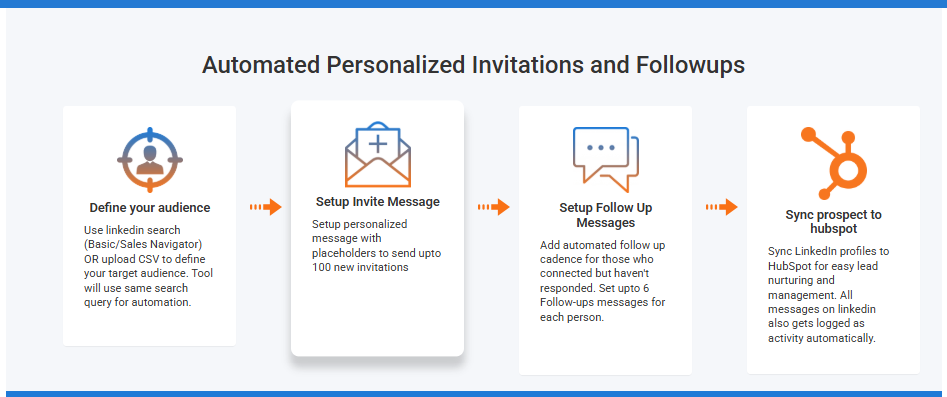 Secuenciación de Mensajes (Cadence): Permite programar flujos lógicos de contacto que incluyen solicitudes de conexión y múltiples seguimientos (follow-ups) con intervalos de tiempo definidos.