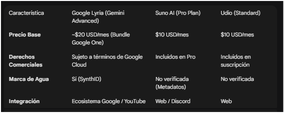 A la fecha de este análisis, el acceso a Lyria se gestiona principalmente a través de suscripciones de Google Workspace y Gemini Advanced.