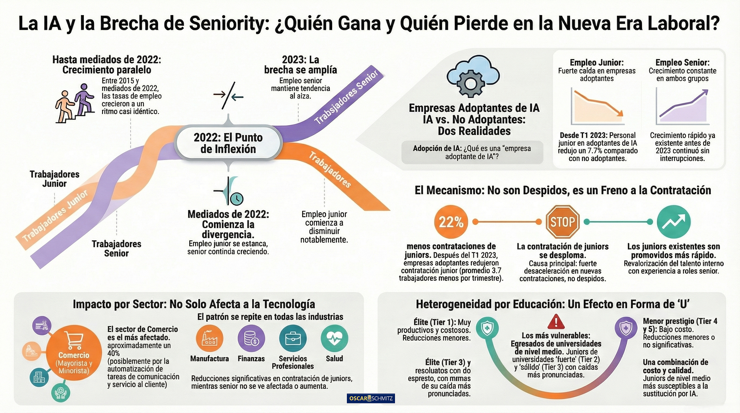 Este estudio investiga si la inteligencia artificial generativa representa un cambio tecnológico sesgado hacia la antigüedad (seniority-biased technological change), afectando desproporcionadamente a los trabajadores junior en comparación con los senior.