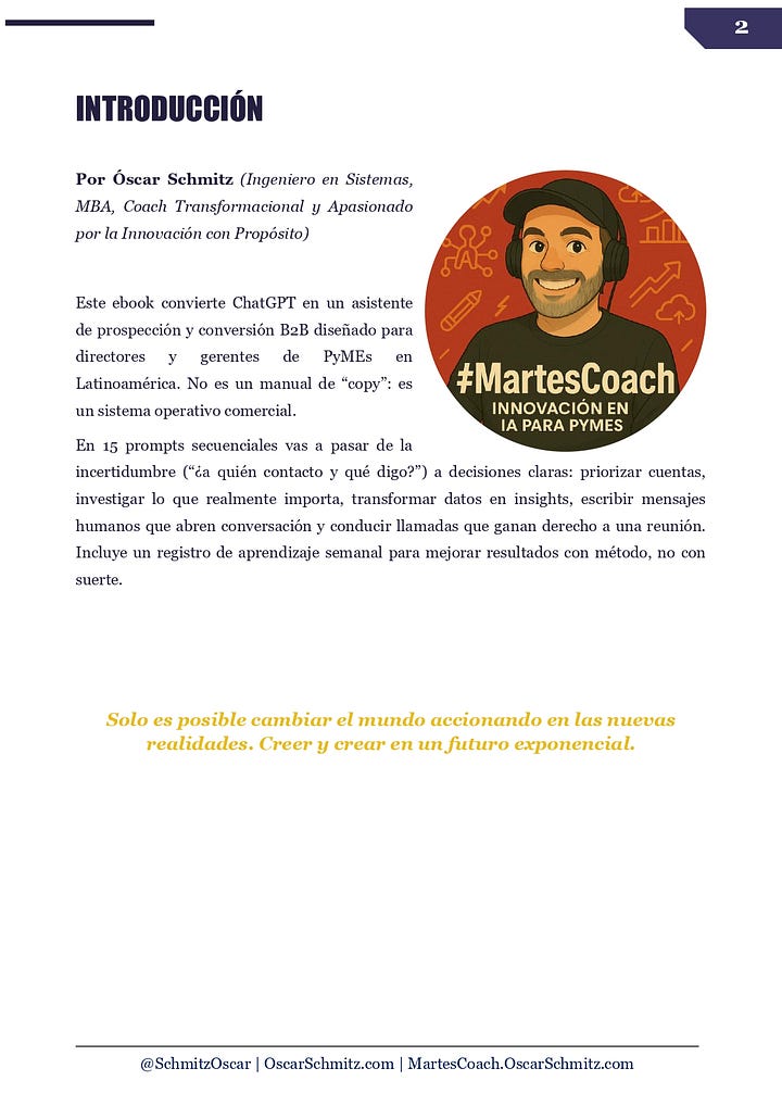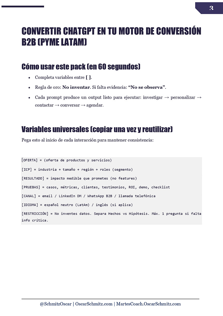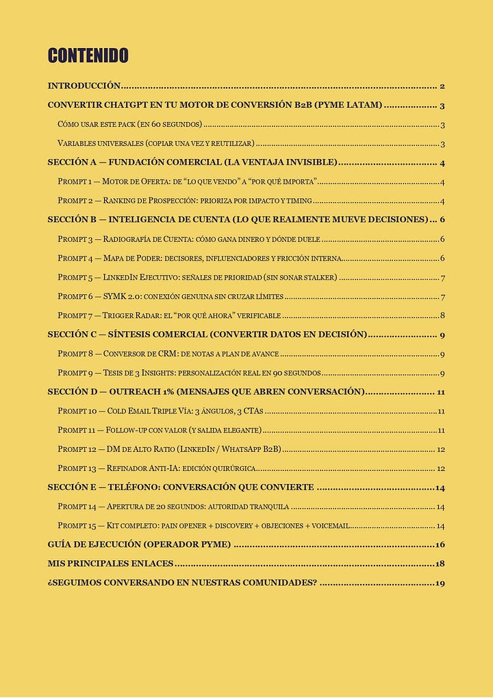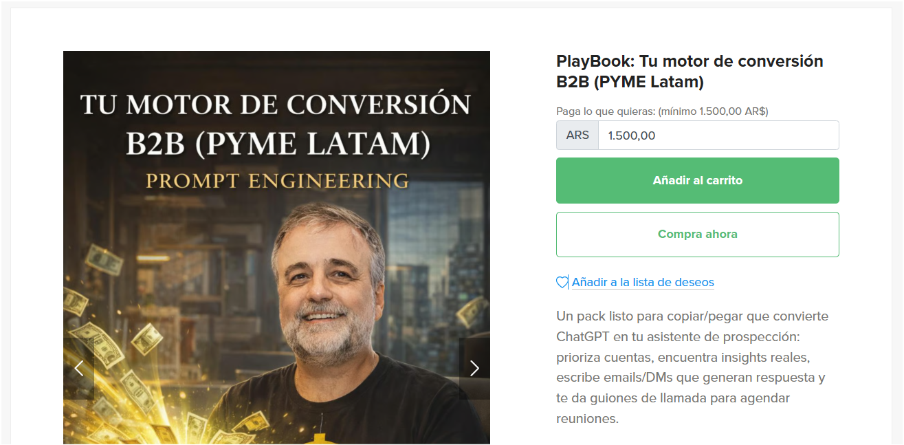 🛒 Por eso hoy publico “Convertir ChatGPT en tu Motor de Conversión B2B (PyME LATAM)”: un pack de 15 prompts secuenciales, listos para copiar y pegar, diseñado para directores y gerentes que necesitan resultados en el mundo real: respuestas, reuniones y pipeline.