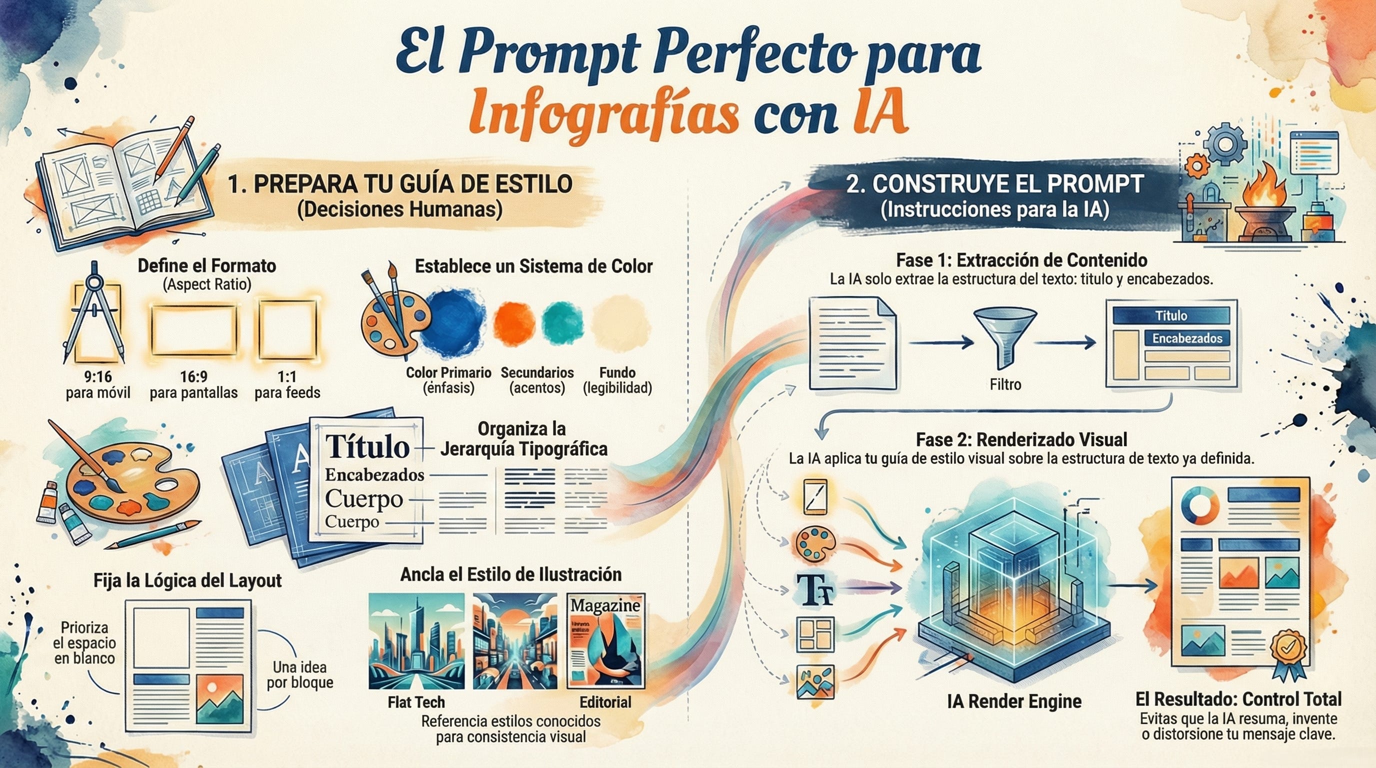 Render (diseño con guía de estilo): la IA compone la infografía usando exclusivamente esos elementos y tus reglas visuales.