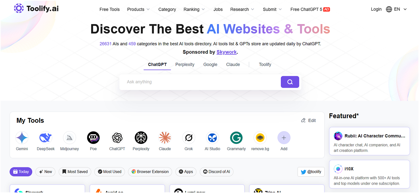 Toolify.ai es un directorio exhaustivo de herramientas de inteligencia artificial, diseñado para centralizar y facilitar el acceso a la creciente oferta de soluciones de IA. La plataforma cataloga más de 26,000 herramientas distribuidas en 459 categorías, abarcando desde productividad y generación de contenido multimedia hasta desarrollo de software, análisis de datos y bienestar.