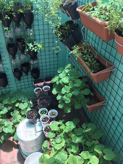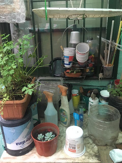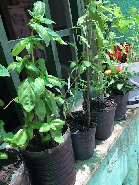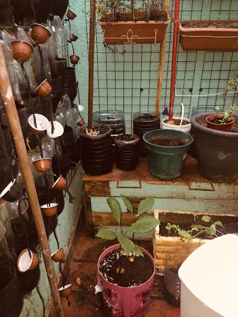โป๏ธ Sin contar con un espacio de tierra "natural", hemos creado y reciclando materiales plรกsticos, madera y contenedores diversos, para la plantaciรณn de cultivos donde prevalece el verde con diferentes sabores y aplicaciones.ย