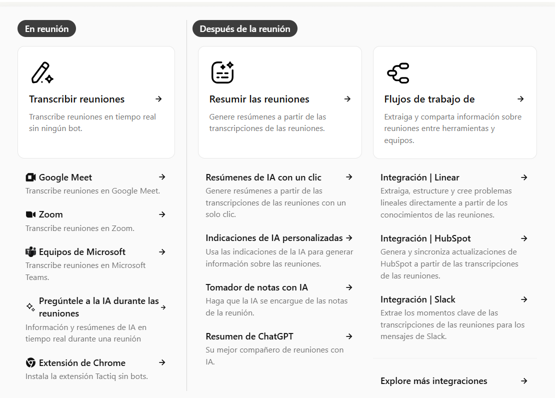 Tactiq es una herramienta en línea de transcripción y toma de notas durante reuniones en vivo. Se integra con plataformas de videoconferencia y la capacidad de compartir notas y transcripciones con otros participantes de la reunión.